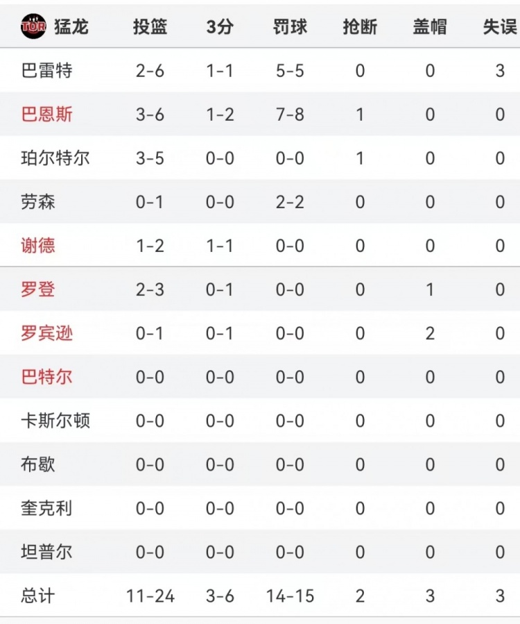 猛龍首節(jié)堅決沖擊內(nèi)線頻頻獲得罰球,并且罰球命中率非常不錯,全隊15次罰球機會,罰進14球。其中巴恩斯8罰7中,巴雷特5罰5中。