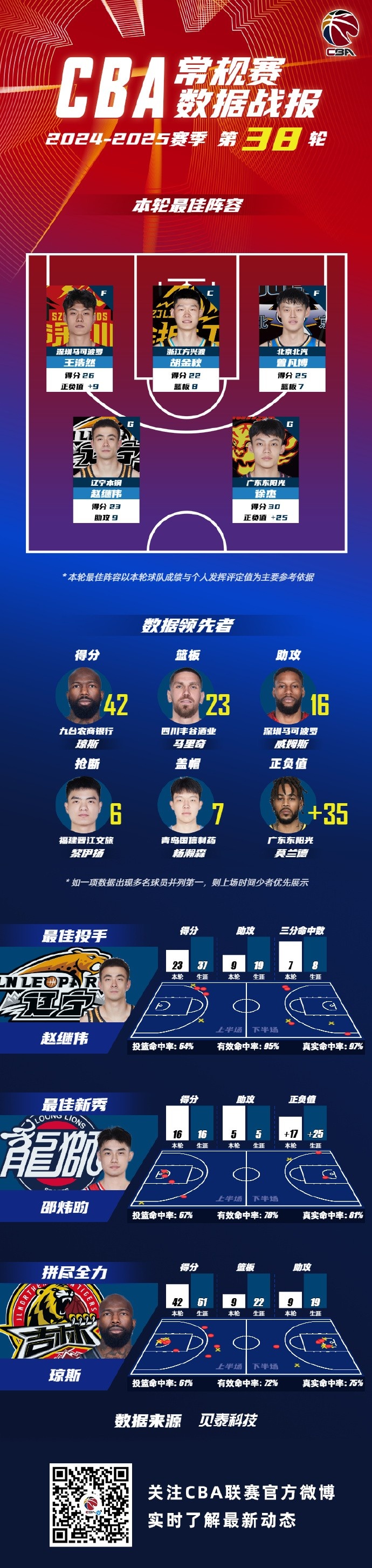 2024-2025賽季CBA聯(lián)賽常規(guī)賽第38輪結(jié)束較量,來自深圳新世紀(jì)烈豹籃球俱樂部的王浩然,浙江廣廈籃球俱樂部的胡金秋,北京首鋼籃球俱樂部的曾凡博,遼寧沈陽三生飛豹籃球俱樂部的趙繼偉和廣東宏遠(yuǎn)籃球俱樂部的徐杰入選CBA聯(lián)賽常規(guī)賽第38輪最佳陣容!