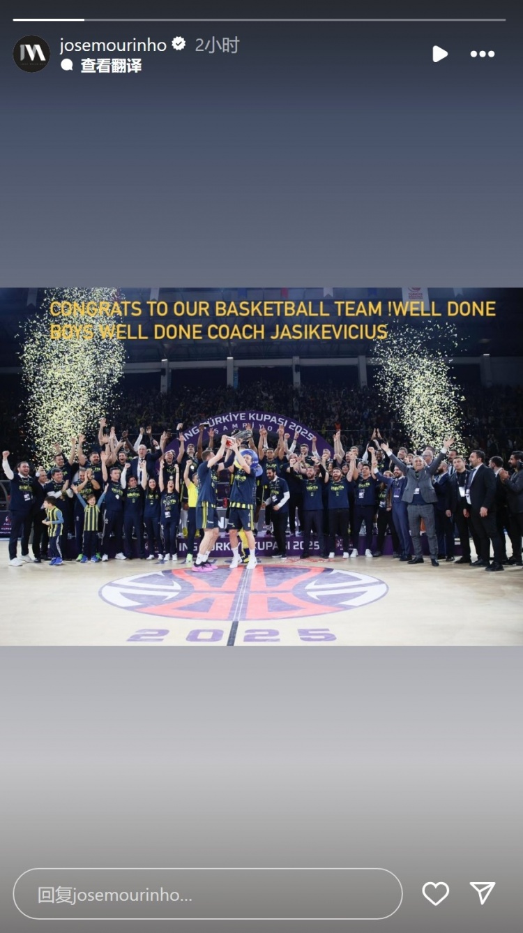 穆里尼奧更新社媒動態(tài),曬出費內(nèi)巴切籃球隊捧杯的照片,并配文:“祝賀我們的籃球隊!做得好小伙子們,做得好主帥雅西科維丘斯!”