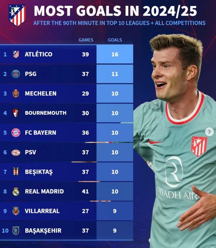 2月26日訊 馬競(jìng)在本輪國(guó)王杯補(bǔ)時(shí)絕平巴薩,數(shù)據(jù)統(tǒng)計(jì)顯示他們也是本賽季歐陸補(bǔ)時(shí)進(jìn)球最多的球隊(duì)。