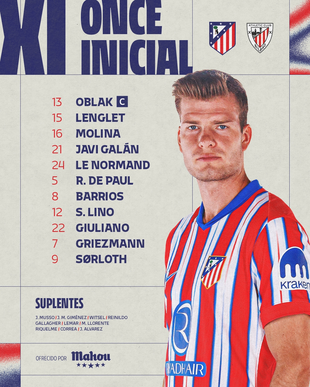 馬競(jìng)首發(fā):13-奧布拉克、15-朗格萊、16-莫利納、21-加蘭、24-勒諾爾芒、5-德保羅、8-巴勃羅-巴里奧斯、12-利諾、22朱利亞諾-西蒙尼、7-格列茲曼、9-索爾洛特