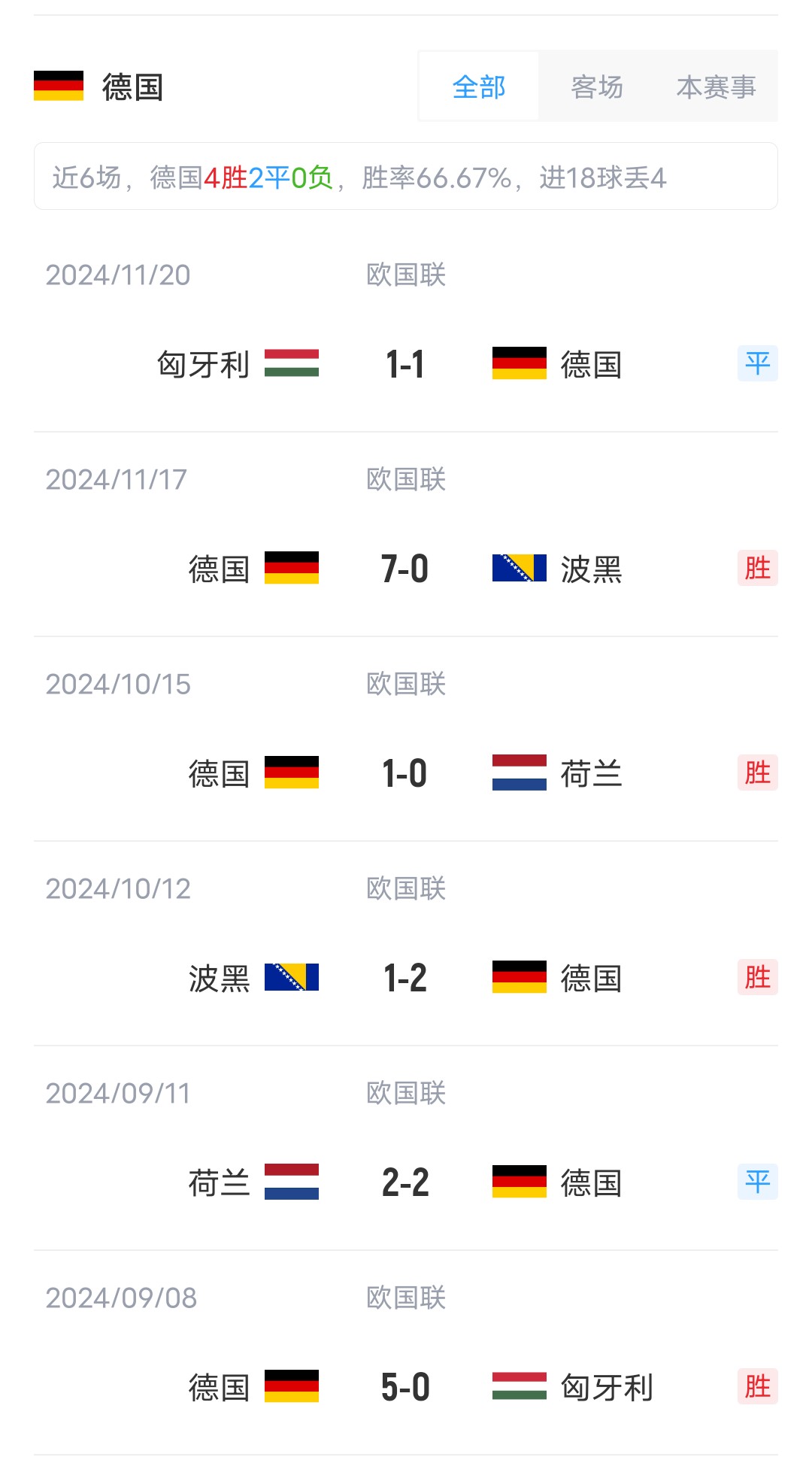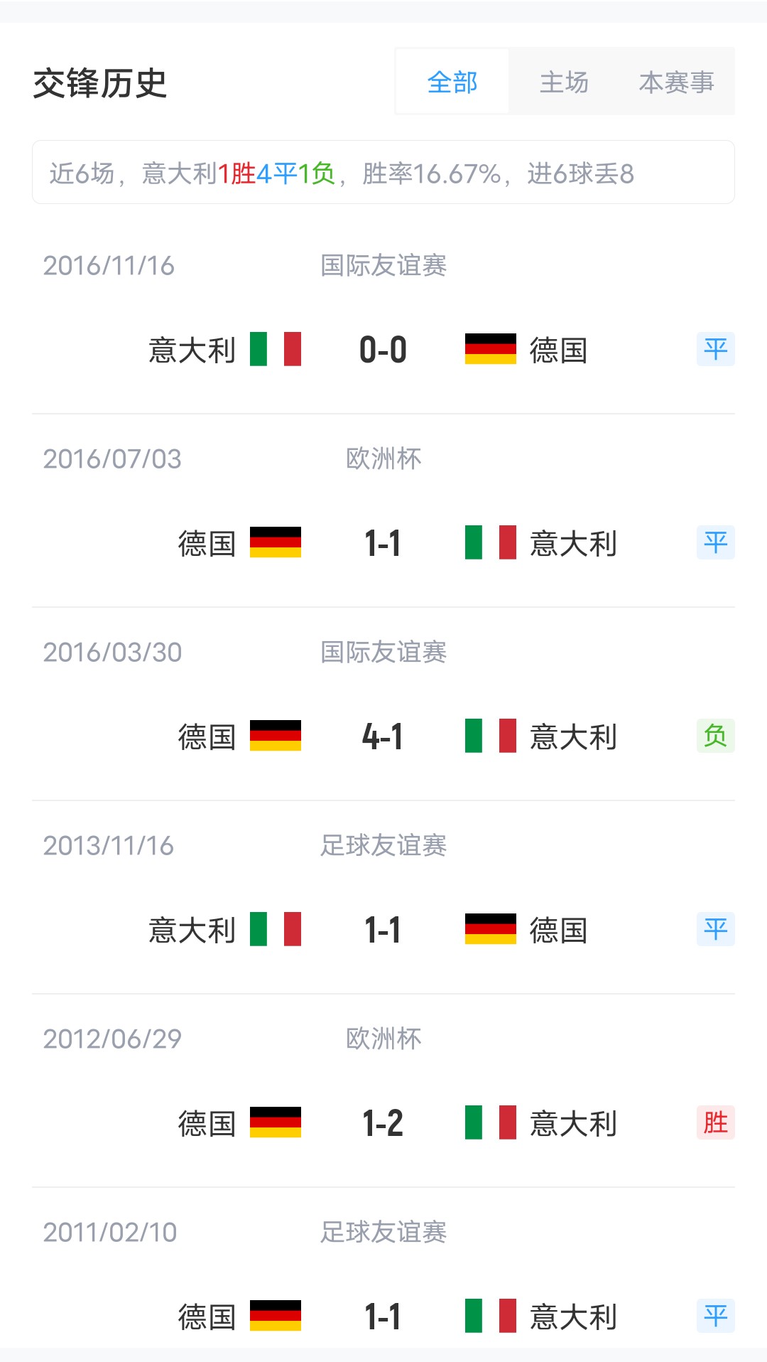 在歐國聯(lián)小組賽中,意大利排名B組第2,德國排名C組第1;雙方近6場直接對話中,意大利取得了1勝4平1負(fù)的戰(zhàn)績。兩隊(duì)最近一次交手,是在2016年11月16日,友誼賽意大利0-0戰(zhàn)平德國。